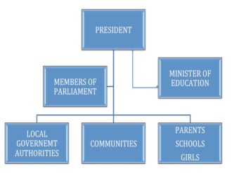 The relationship between all stakeholders should be fluid and multidirectional. This means that they all must be held accountable for their duties to educate girls and answerable to one another. However, as illustrated in the diagram, appointed ministers only have a relationship with the president, therefore are only answerable to him. He appoints them to implement his agenda, whether it is an agenda for prosperity or agenda for spoilspoility, as locals call it, ministers hold sticks to beat down the path and threaten the people, in pursuit of the president’s agenda.