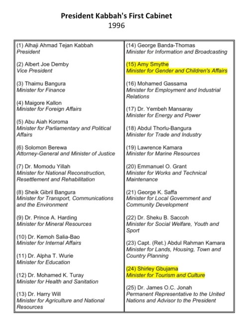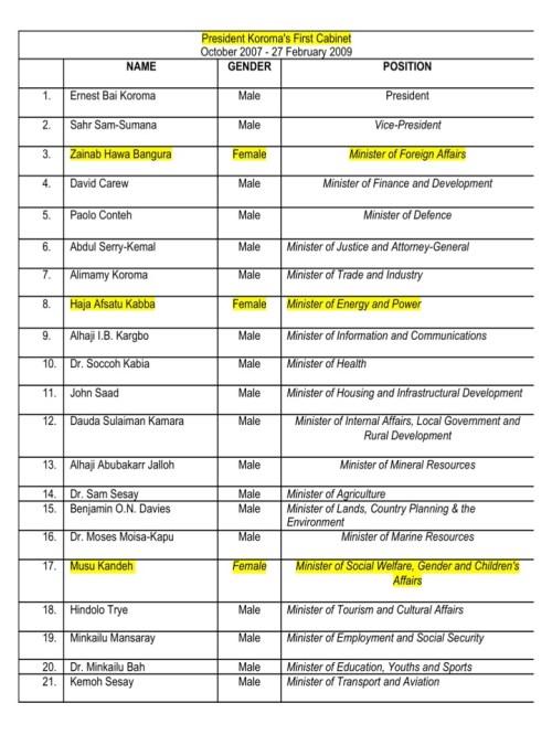 President Ahmed Tejan Kabba of the SLPP, who was replaced by the APC President Koroma, was not much of a friend to women in his appointments either. His first full cabinet of 25 members consisted of only 2 women. Pathetic!