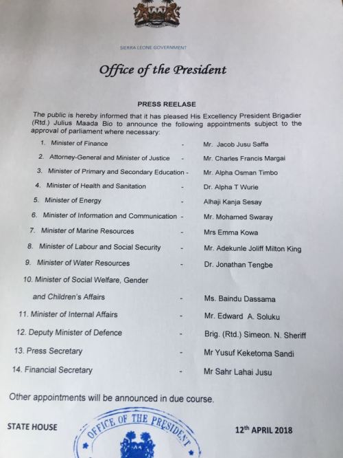 Sierra Leone’s new President, Julius Maada Bio, has started appointing members of his cabinet. As promised, Mama Salone is paying close attention to the gender mix of this administration. The Press Release indicates that more appointments will be following soon.