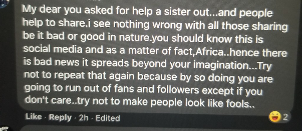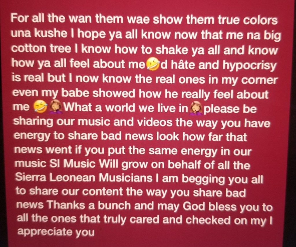 The photos she shared were clearly photos that were neither previously shared on her social media posts nor on the social media posts of the young man in question. Her motive to gain sympathy-clicks and shares on social media became obvious a couple of days after pity partying with her sympathizing fans. Her lamenting post and photos were shared widely, some fans acted as judges and juries in her case against the unsuspecting young man. However, thank God for decency still being part of Sierra Leonean culture, many of her followers berated her for airing such a personal issue (even if true) on social media, at the expense of the young man. But many also recognized it as a click-baiting, fame-seeking stunt.