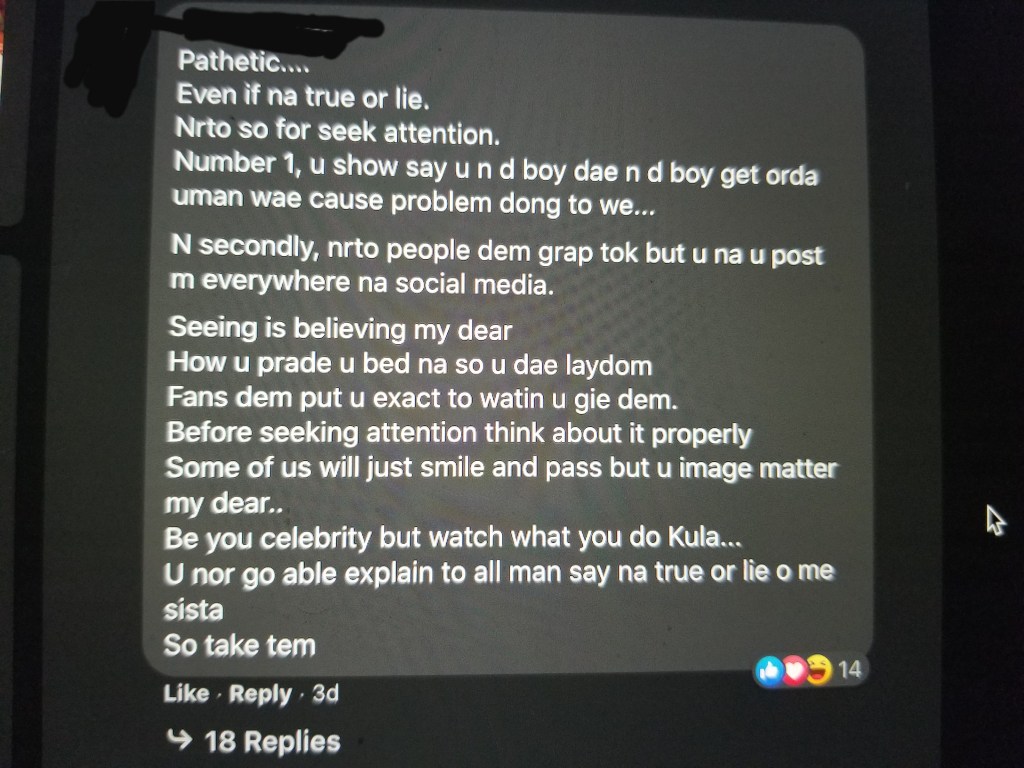 These criticisms led her to post a message on FB complaining that people were more enthusiastic to share her bad news than her dancing videos and was urging fans to now forget about her previous post about her so-called boyfriend to focus on her strip dancing, twerking videos.