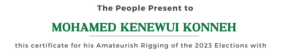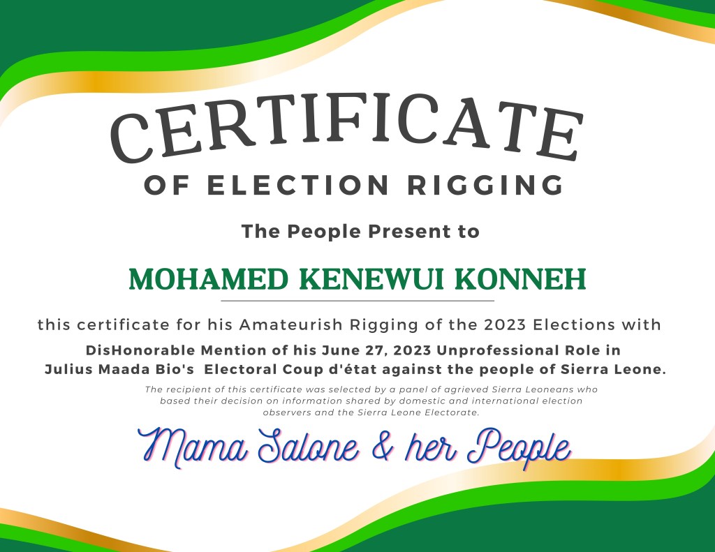 Therefore, it has pleased Mama Salone and her People to present this Certificate of Election Rigging to Mohamed Kenewui Konneh for carrying out and sustaining his fraudulent activities from start to finish.