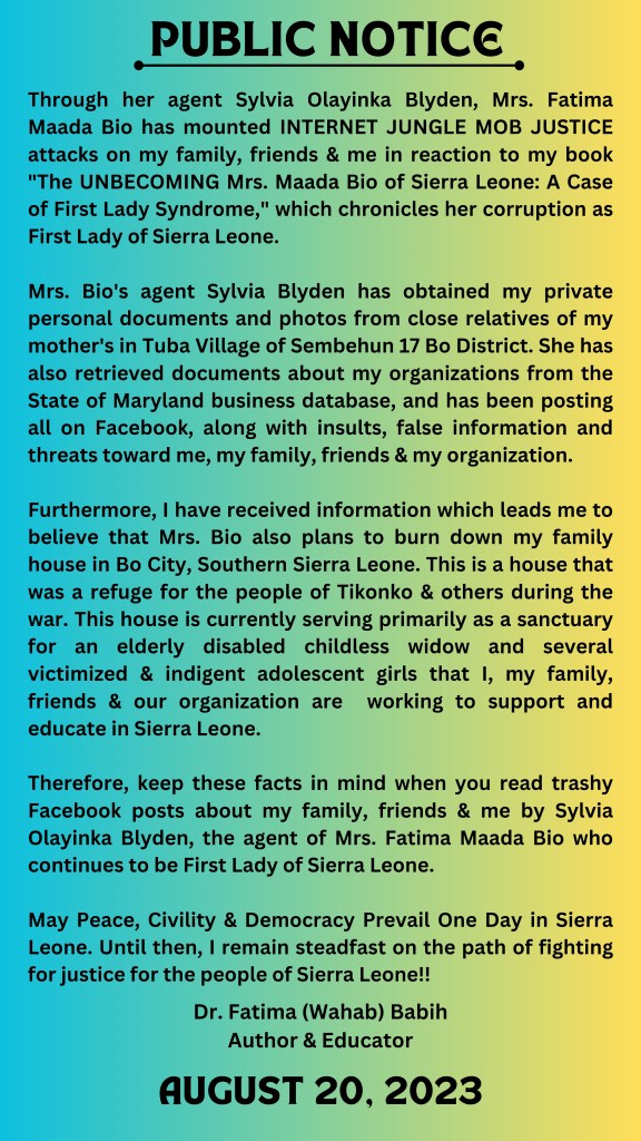 Shortly after publishing my Public Notice (see below) about Mrs. Bio’s internet jungle justice attacks against my family, friends, and me, as well as her plans to burn down my family home in Bo City, Mrs. Bio reacted, through her errand girl, Sylvia Olayinka Blyden (Ooman Arata) the leading savage actor in this jungle justice drama.