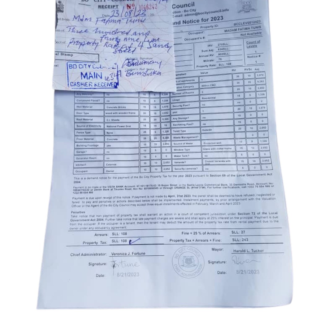 Upon my family’s insistence that Mr. Keily was not our family member, nor did we know him, Mr. Bangura returned to his office to bring us the 2023 tax bill. Upon receiving the bill, my family paid Mr. Bangura (see photo below).