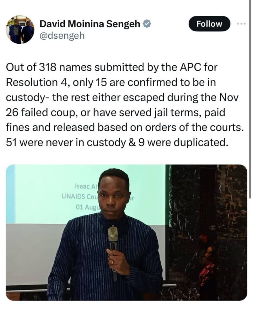 According to the post, of the 318 names submitted by the APC for Resolution 4, only 15 remain confirmed to be in custody. The explanation given by Sengeh suggested that a majority of these individuals had either escaped during the failed coup attempt on November 26, served their jail terms, paid fines, or were released by court orders. Disturbingly, he also mentioned that 51 names were never in custody, and 9 were duplicates.