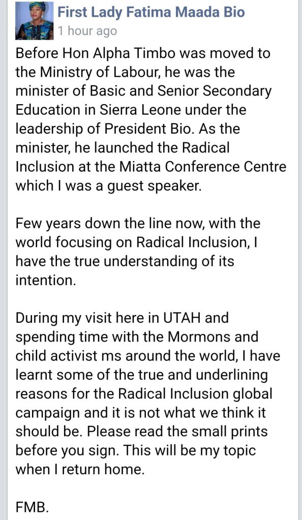 The post in question below, shared on her Face Book page, is a pointed attack on one of her husband’s most prominent appointees—Chief Minister Dr. David M. Sengeh.