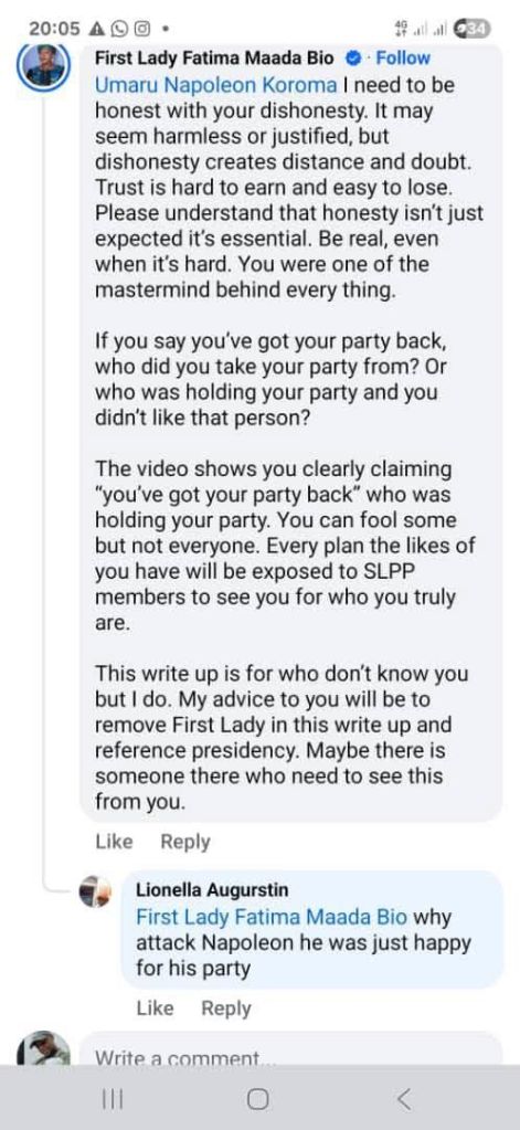 Fatima Bio’s latest Facebook tirade is a textbook example of her brand of political sabotage, vindictive, calculated, and dripping with the arrogance of someone who mistakes intimidation for influence. This time, her target is Umaru Napoleon Koroma, a key figure in the SLPP, and the method is as predictable as it is corrosive: stoking suspicion at the very top of the party.