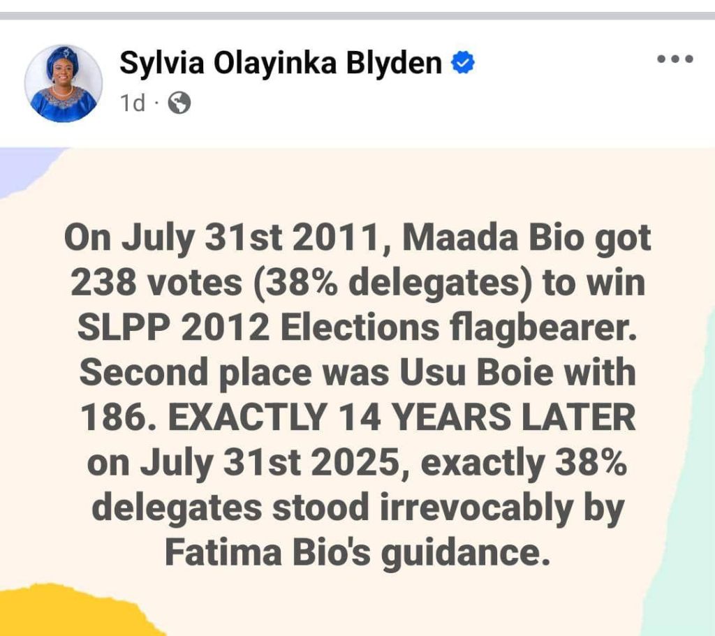 Fatima Jabbie Bio and her paid agents think they are playing smart politics. But every time I read the propaganda they churn out in her praise, all I see are not-so-smart stunts. The latest example is the claim in the attached post by her chief agent, that she somehow “won” 38% at the recently concluded SLPP convention.