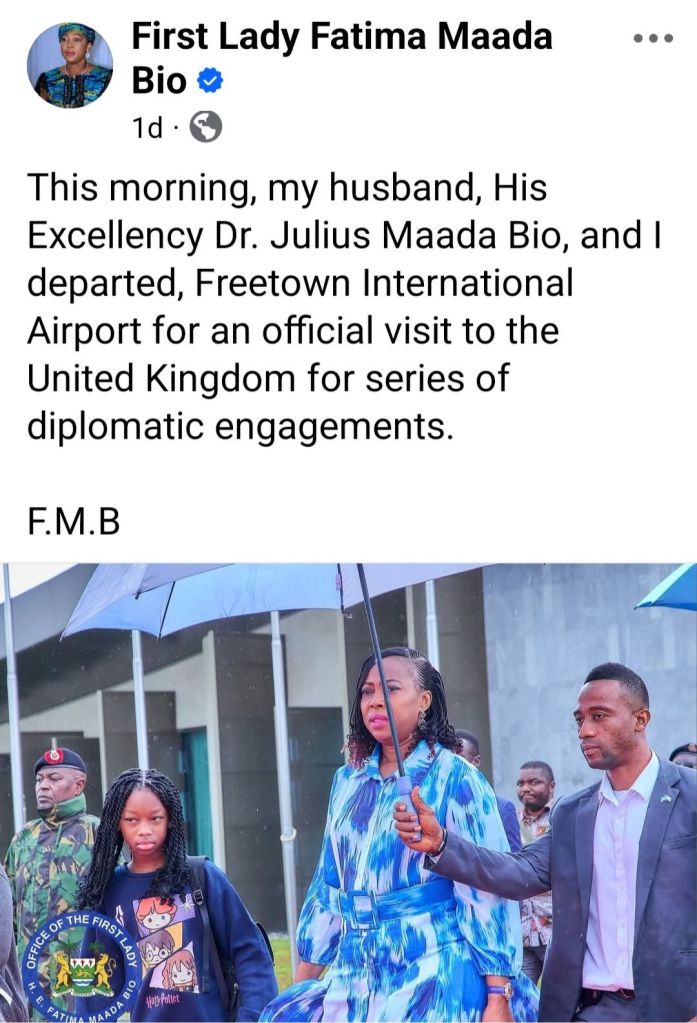 Only days later, back in Freetown, Fatima Bio announced on Facebook that she and her husband were traveling to the UK for “diplomatic engagements.”