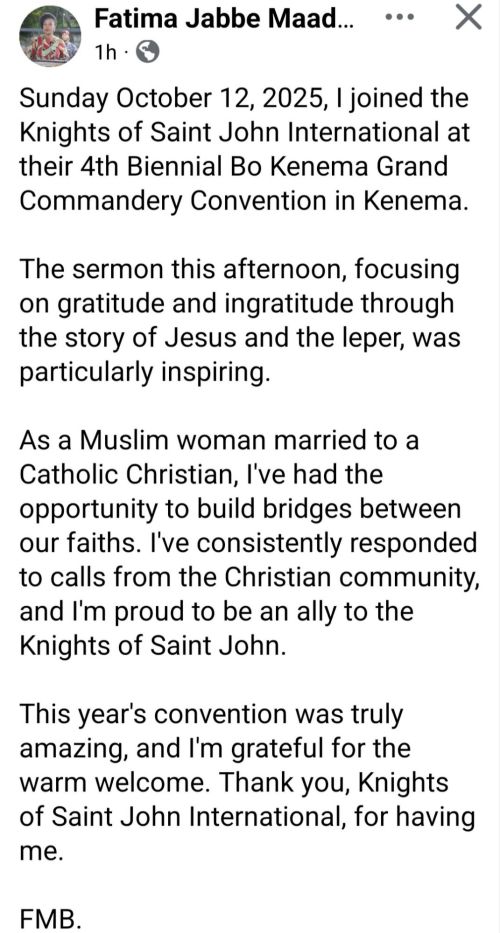 Once again she attempted to cast herself in a role that Sierra Leone never needed her to play, the self-proclaimed “bridge builder” between Muslims and Christians. In her recent Facebook post, she claims that as “a Muslim woman married to a Catholic Christian,” she has become an ally to both faiths and a unifier of religious communities in the country.