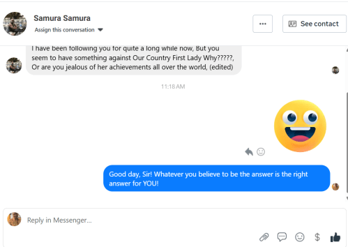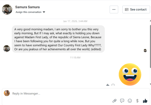 This message greeted me today when I opened Facebook Messenger, which I seldom do because it is one of the platforms Fatima Bio’s hired online thugs use to harass me. The sender, like countless others before him, reduces my patriotic duty to speak truth to power into mere jealousy or personal vendetta, because (s)he has no real defence to put up for the most corrupt First Lady in the history of Sierra Leone.