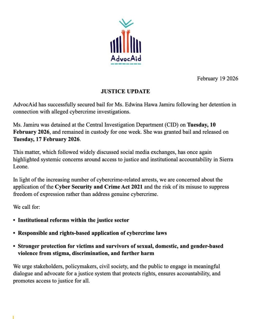 On February 9, 2026, First Lady Fatima Bio publicly described Edwina on AYV TV as a young woman who “sleeps around with men.” Edwina responded defending her dignity. Shortly after, Edwina disappeared and went silent.