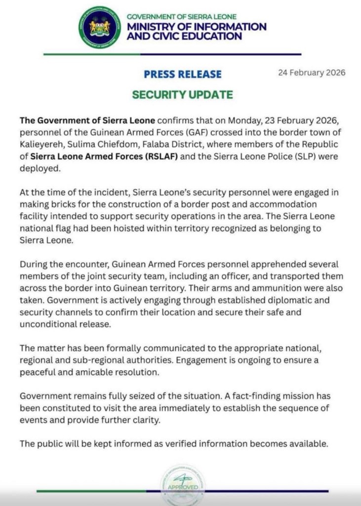 The border incident now exposes what that energy has cost the country: deficiencies in military readiness, strategic coordination at the border, and intelligence and surveillance capacity that left Sierra Leonean soldiers vulnerable to detention by a neighboring force.