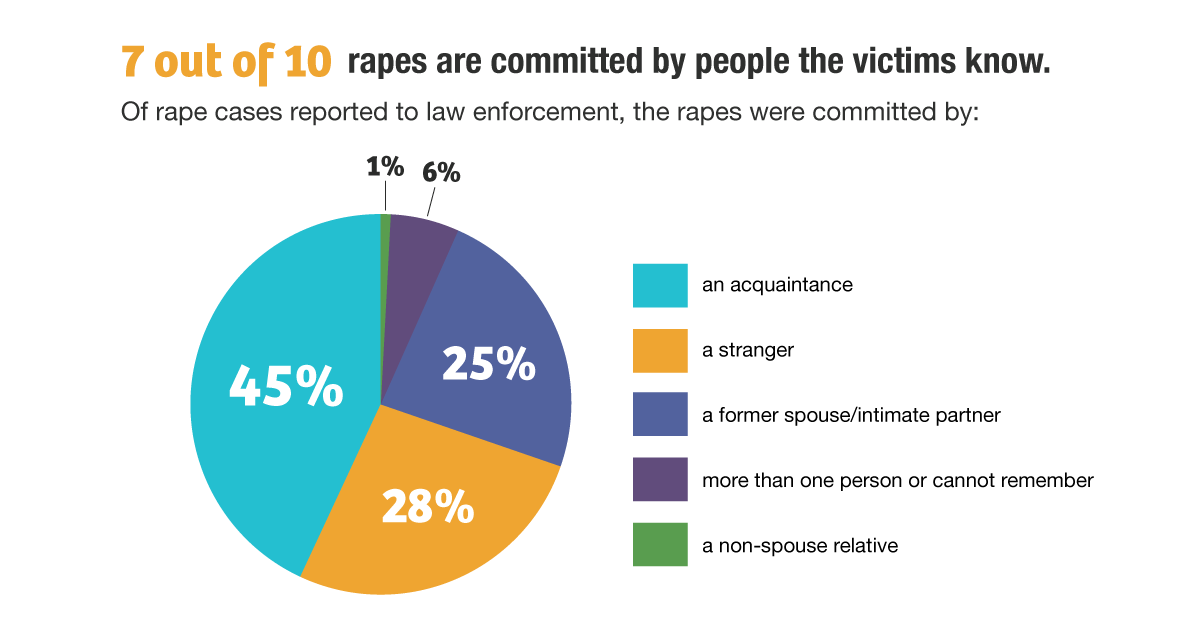 Sadly, statistics show that nearly 75% of RAPISTS are not strangers to their victims, so only 25% of rapes are committed by people outside the family and community of the victim.