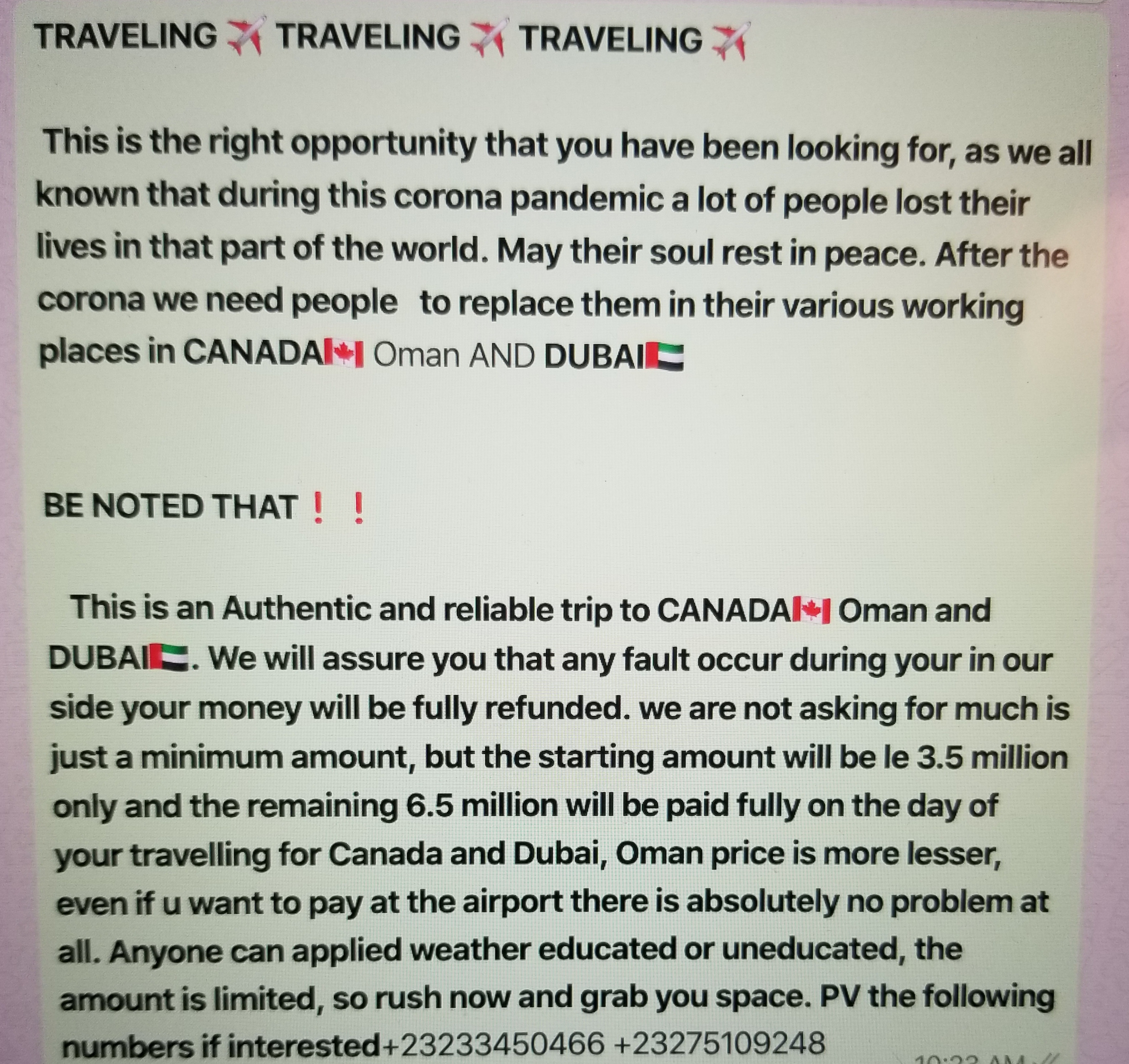 The image below is an example of the bold advertisement by recruiters in Sierra Leone, who are OPENLY sharing these ads on WhatsApp groups, and probably through other non-electronic means.